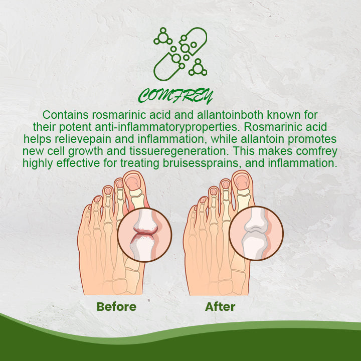 - Contains rosmarinic acid and allantoin, both known for their potent anti-inflammatory properties. Rosmarinic acid helps relieve pain and inflammation, while allantoin promotes new cell growth and tissue regeneration. This makes comfrey highly effective for treating bruises, sprains, and inflammation.