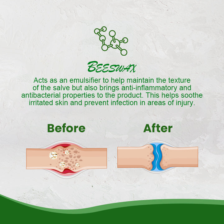 - Acts as an emulsifier to help maintain the texture of the salve, but also brings anti-inflammatory and antibacterial properties to the product. This helps soothe irritated skin and prevent infection in areas of injury.